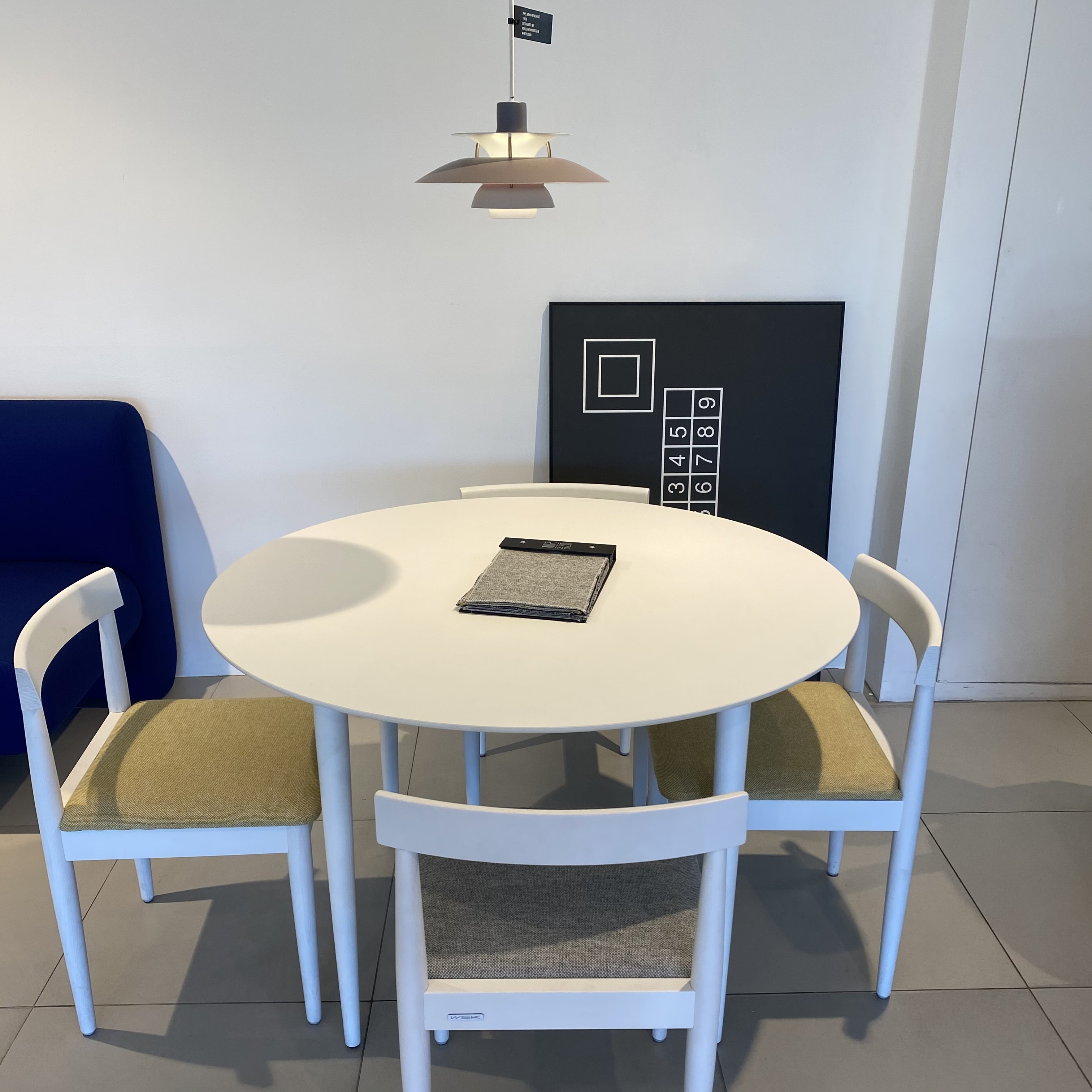 왼쪽 사진처럼 1000~1100 크기 라운드테이블에는 정사이즈 루이스폴센 PH5(지름 50cm)가 맞는 크기인 것 같다.